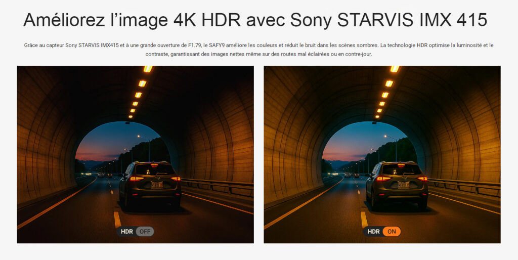 Cette caméra embarquée haut de gamme offre une vidéo 4K Ultra HD d’une netteté exceptionnelle (à l’avant) et Full HD 1080p (à l’arrière), grâce à ses capteurs Sony STARVIS de pointe qui garantissent une qualité d’image professionnelle.