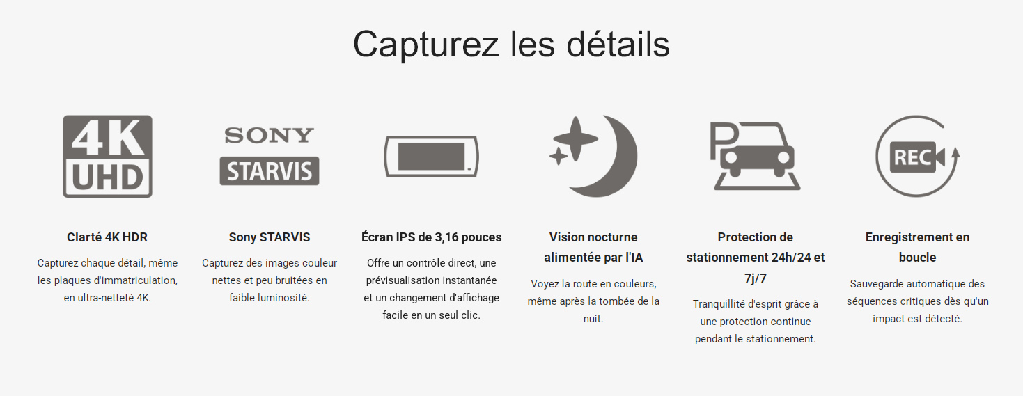 Enregistrement ultra-net 4K à l’avant et Full HD à l’arrière grâce aux capteurs Sony STARVIS