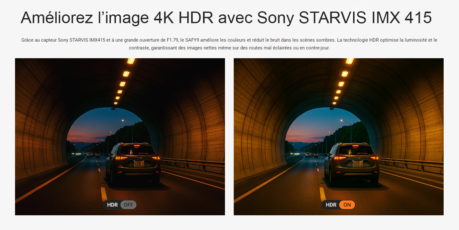 Cette caméra embarquée haut de gamme offre une vidéo 4K Ultra HD d’une netteté exceptionnelle (à l’avant) et Full HD 1080p (à l’arrière), grâce à ses capteurs Sony STARVIS de pointe qui garantissent une qualité d’image professionnelle.