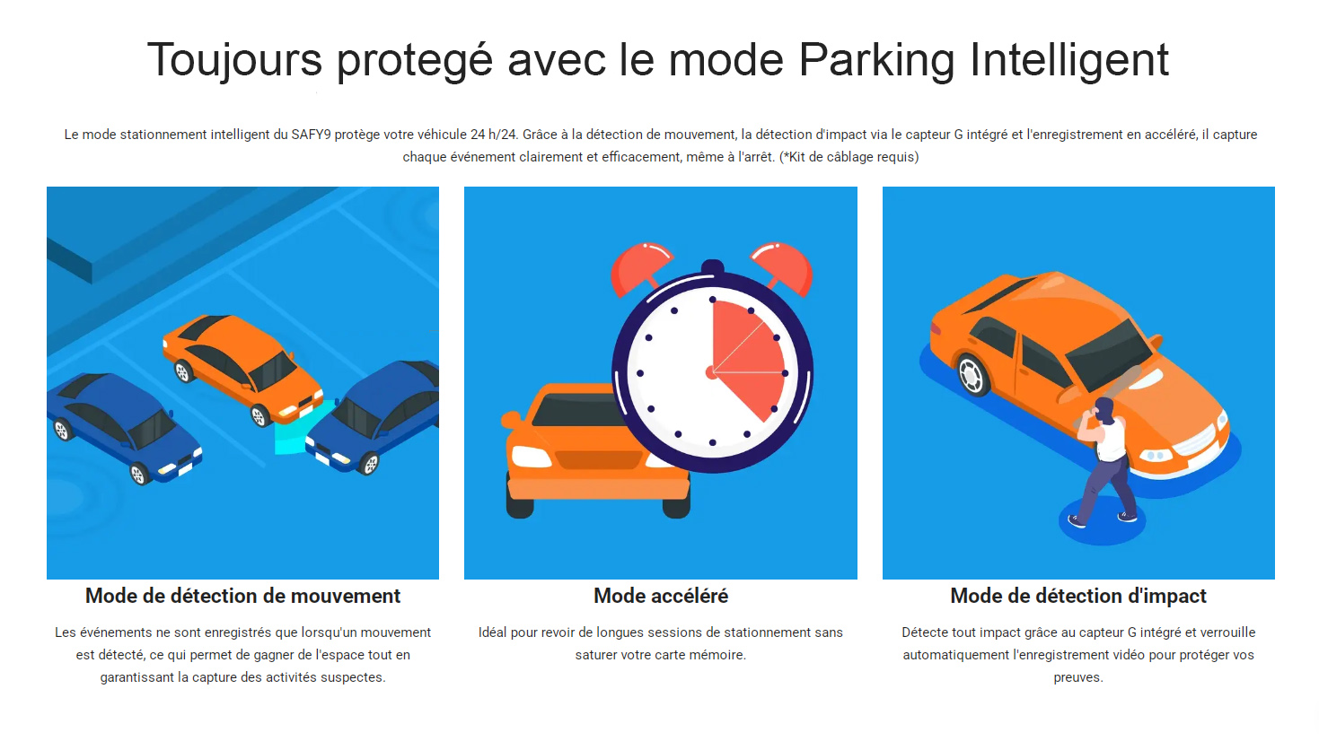 | Mode stationnement | Détection d’impact, détection de mouvement, enregistrement en accéléré (time-lapse) |